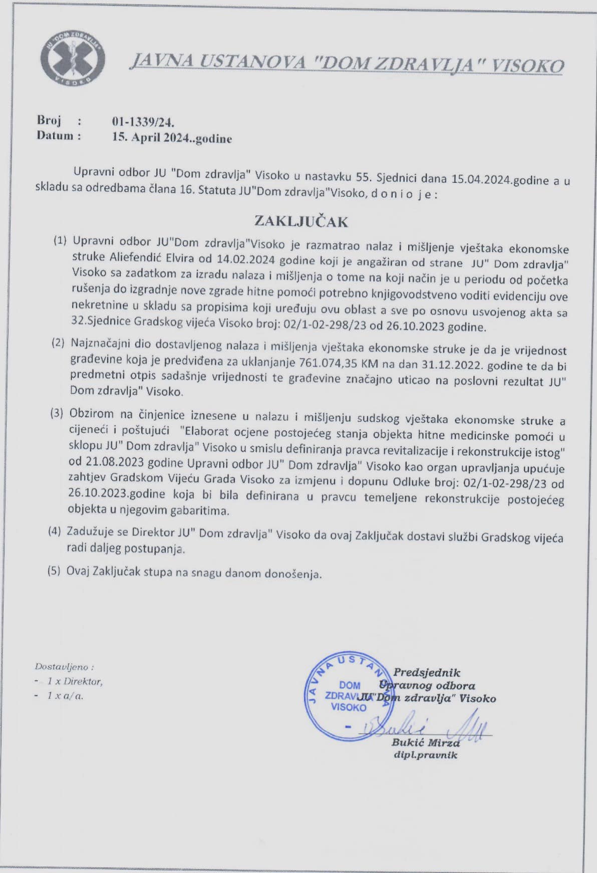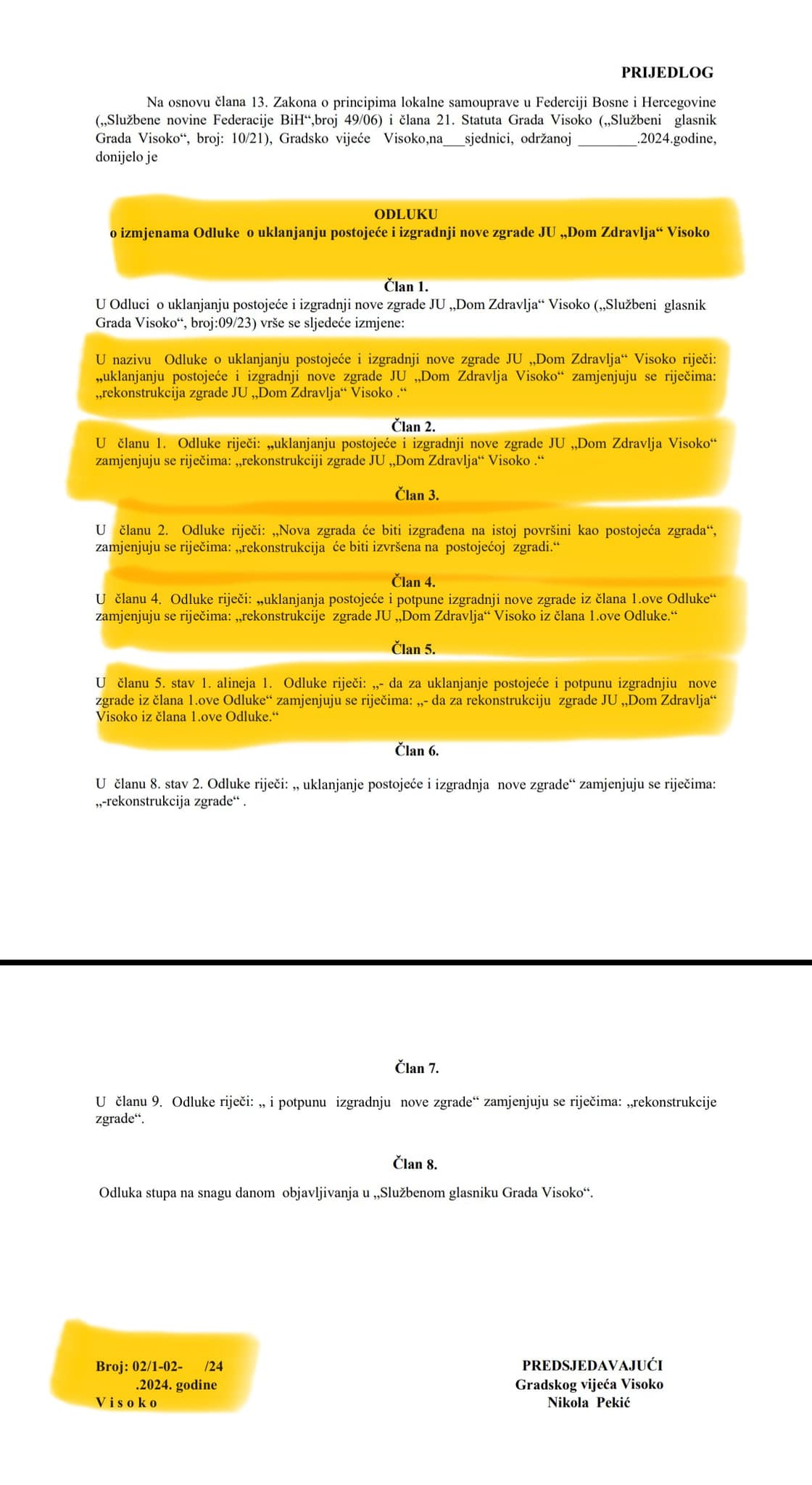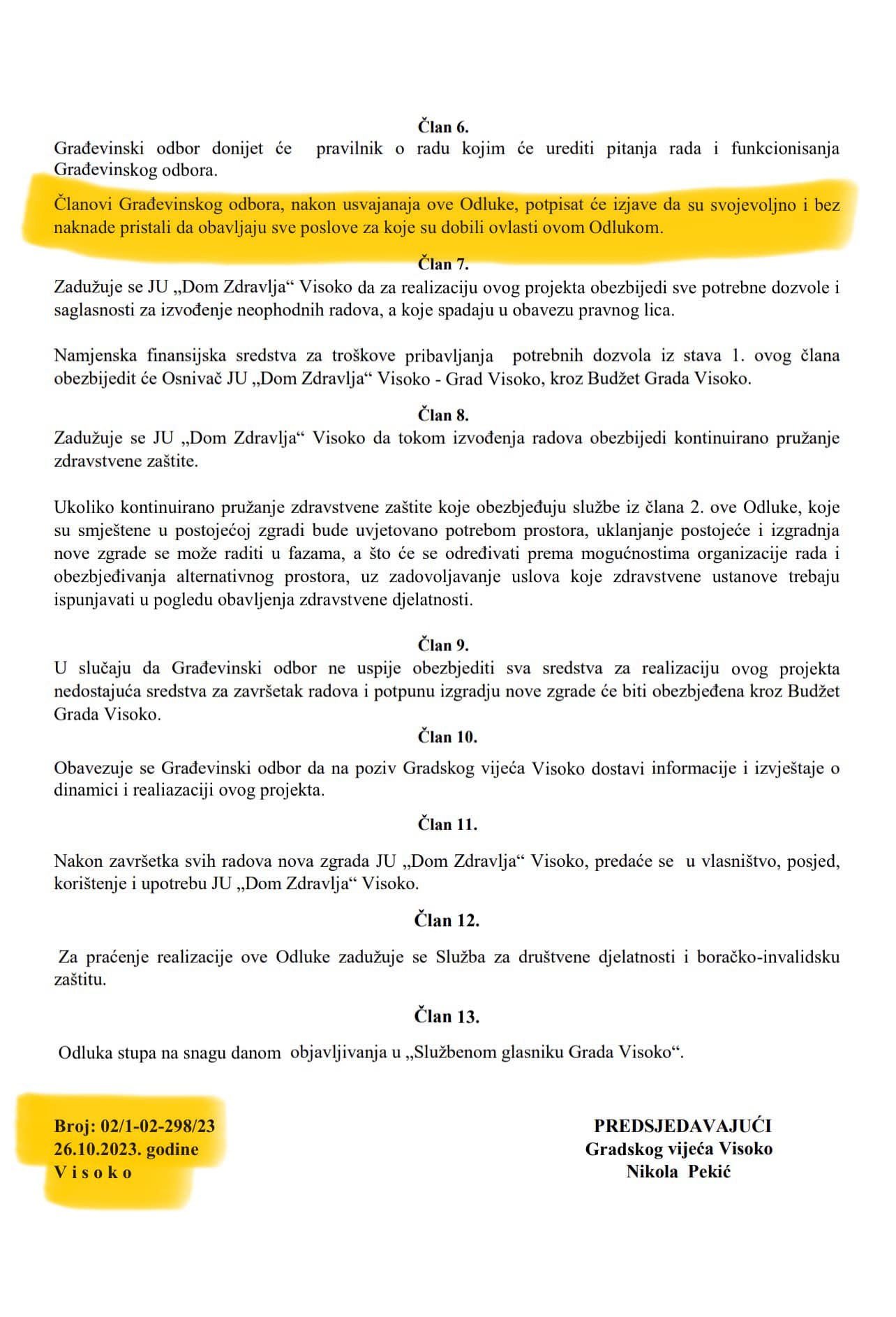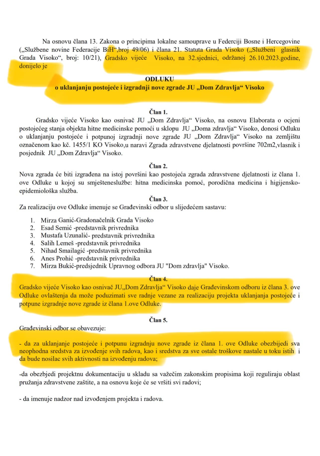 ⏯️ U Članu 4 ove Odluke jasno stoji da Gradsko vijeće Visoko, kao osnivač JU „Dom Zdravlja“ Visoko, daje Građevinskom odboru iz člana 3. ove Odluke ovlaštenja da može poduzimati sve radnje vezane za realizaciju projekta uklanjanja postojeće i potpune izgradnje “NOVE ZGRADE” iz člana 1.ove Odluke (slike u prilogu teksta)