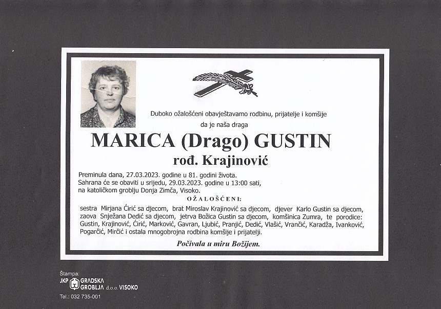 GUSTIN (Drago) MARICA 29.03.2023. godine u 13:00 sati 29. Marta 2023. GUSTIN (Drago) MARICA 29.03.2023. godine u 13:00 sati