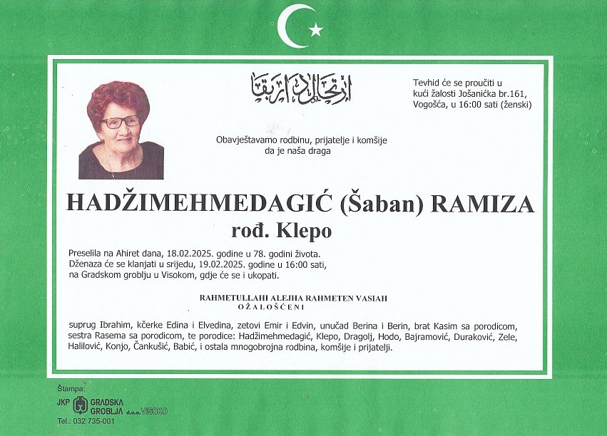 HADŽIMEHMEDAGIĆ (Šaban) RAMIZA 19.02.2025. godine u 16:00 sati 18. Februara 2025. HADŽIMEHMEDAGIĆ (Šaban) RAMIZA 19.02.2025. godine u 16:00 sati