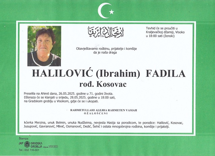 HALILOVIĆ (Ibrahim) FADILA 28.05.2025. godine u 18:00 sati 28. Maja 2025. HALILOVIĆ (Ibrahim) FADILA 28.05.2025. godine u 18:00 sati