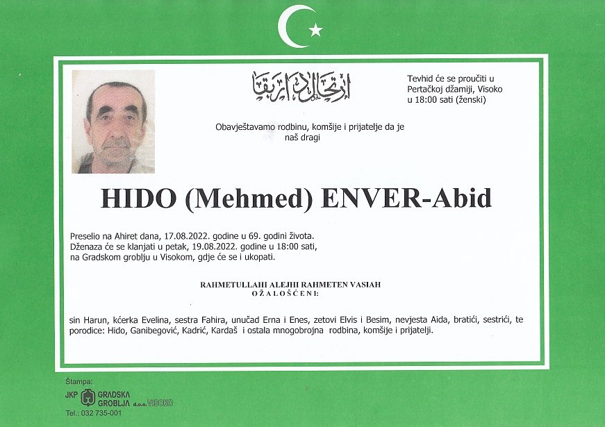 HIDO (Mehmed) ENVER 19.08.2022. godine u 18:00 sati 18. Augusta 2022. HIDO (Mehmed) ENVER 19.08.2022. godine u 18:00 sati