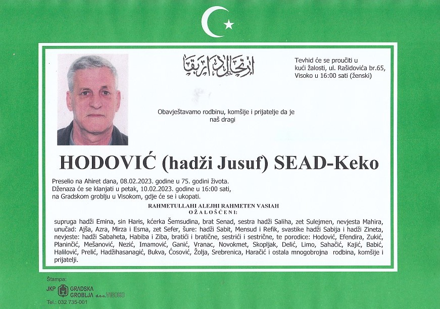 HODOVIĆ (Jusuf) SEAD 10.02.2023. godine u 16:00 sati 9. Februara 2023. HODOVIĆ (Jusuf) SEAD 10.02.2023. godine u 16:00 sati