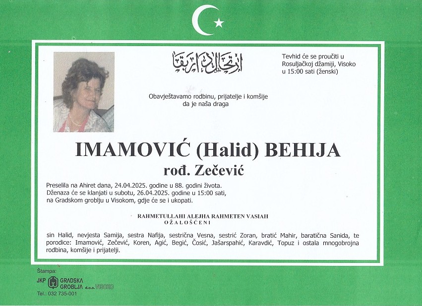 IMAMOVIĆ (Halid) BEHIJA 26.04.2025. godine u 15:00 sati 26. Aprila 2025.28. Aprila 2025. IMAMOVIĆ (Halid) BEHIJA 26.04.2025. godine u 15:00 sati