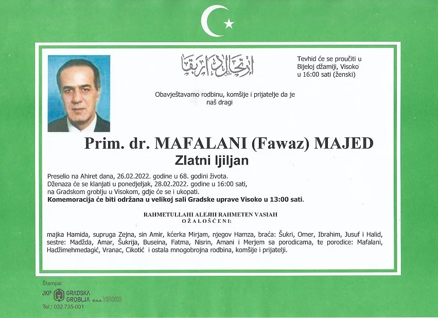 Visoko je u subotu ostalo bez prim. dr. Majeda Mafalanija, poznatog hirurga i čovjeka koji je u mnogome zadužio Visoko i stanovnike ovoga grada ali i šire. Naime, u najtežim vremenima za BiH dr. Mafalani je iz Zagreba došao u tadašnju Ratnu bolnicu u Visokom, iako je prvobitni plan bio odlazak u Sarajevo no zbog blokade glavnog grada ostao je u Visokom. Bilo je to u septembru 1992. godine. Zbog svojih zasluga, u decembru 1993. godine dobio je najveće ratno priznanje “Zlatni ljiljan” i to kao pripadnik Ratne bolnice Visoko, a priznanje mu je lično uručio tadašnji general Rasim Delić. Nakon rata, dr. Mafalani je odlučio ostati u Visokom i nastaviti sa radom u visočkom Domu zdravlja, koje je u međuvremenu “izgubilo” status bolnice. U godinama nakon rata savjesno je obavljao svoj posao hirurga i bio cijenjen od strane kolega i pacijenata. Doktor Mafalani je 2020. godine otišao u zasluženu penziju. Njegovo ime ostaće upisano debelim slovima u istoriji Doma zdravlja Visoko, kao čovjeka koji je spasio mnoge živote, kako u ratu tako i u postratnom periodu