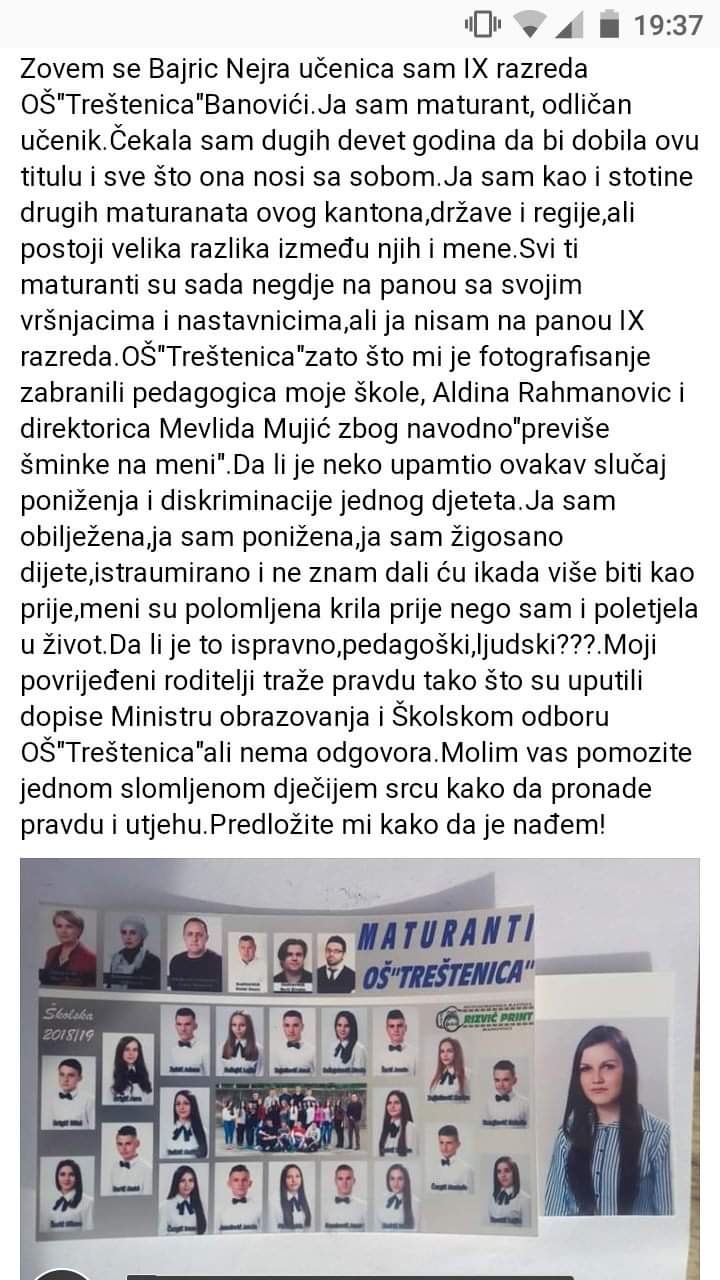 Granice do kojih su spremni da idu u svom primitivizmu, zaostalošću i liječenju kompleksa javno je podijelila Nejra Bajrić. Nejra je hrabra, prelijepa i pri tome odlična učenica devetog razreda OŠ „ Treštenica“ Banovići. Naime, tinejdžerki je zabranjeno postavljanje fotografije na maturski pano od strane pedagogice pomenute škole Aldine Rahmanović, uz potpunu podršku direktorice škole Mevlide Mujić iz razloga što je, pazite ovo, po njihovom mišljenju djevojčica bila previše našminkana. Demokratija je zaplakala, a ljudska prava traže izlaz!