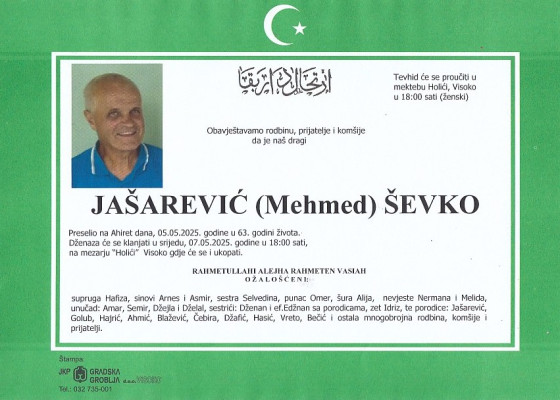 JAŠAREVIĆ (Mehmed) ŠEVKO 07.05.2025. godine u 18:00 sati 6. Maja 2025. JAŠAREVIĆ (Mehmed) ŠEVKO 07.05.2025. godine u 18:00 sati