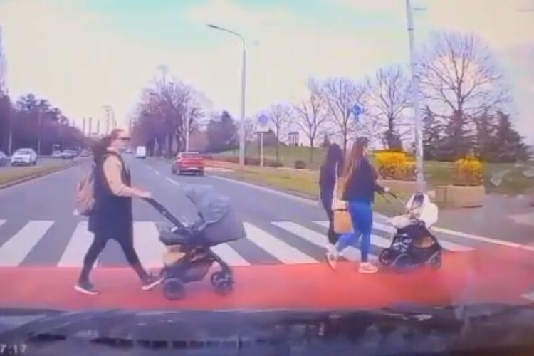 Naime, dok jedan vozač stoji u srednjoj traci i prošupta žene koje guraju dječja kolica – drugi, sa desne strane, velikom brzinom projuri kraj njih.