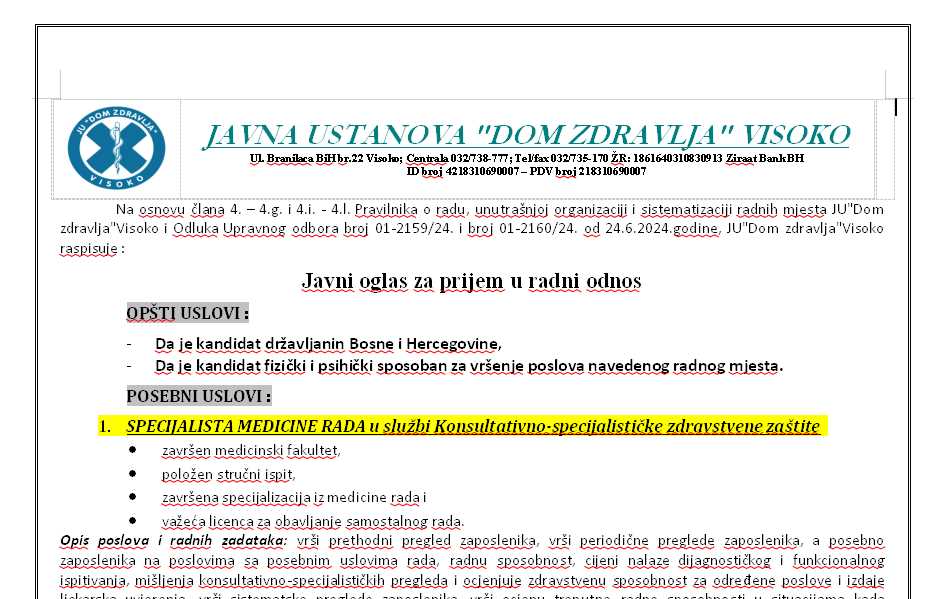 JU “Dom zdarvlja” Visoko: Javni oglas za prijem u radni odnos 5. Jula 2024. JAVNI OGLAS ZA PRIJEM U RADNI ODNOS U JU “DOM ZDRAVLJA” VISOKO TEKST JAVNOG OGLASA POGLEDAJTE OVDJE