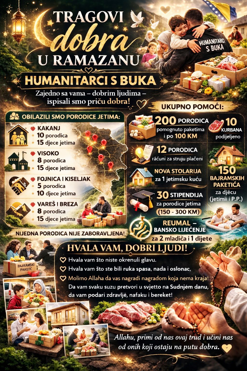 Humanitarci s Buka i ove godine realizovalo je niz aktivnosti tokom mjeseca Ramazana, pružajući pomoć najugroženijim porodicama širom Bosne i Hercegovine.
