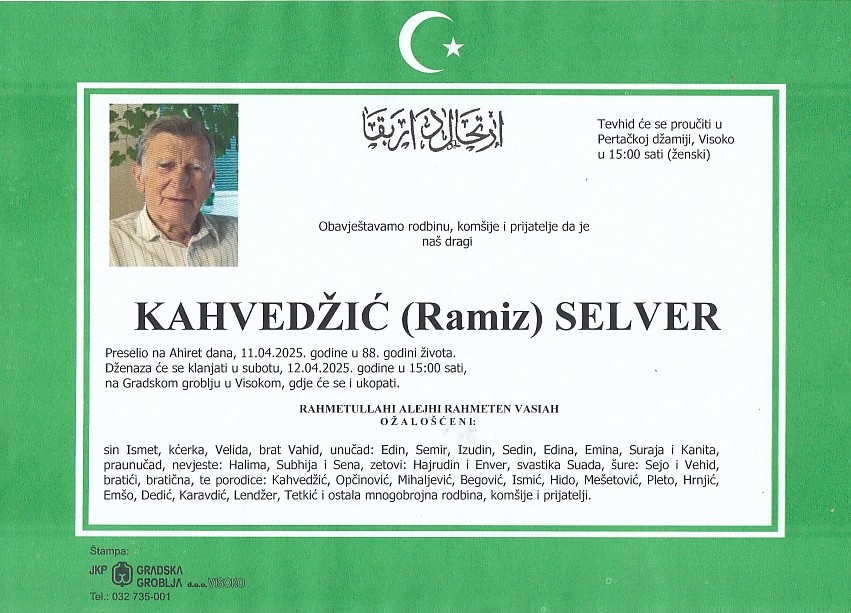 KAHVEDŽIĆ (Ramiz) SELVER 12.04.2025. godine u 15:00 sati 12. Aprila 2025.15. Aprila 2025. KAHVEDŽIĆ (Ramiz) SELVER 12.04.2025. godine u 15:00 sati