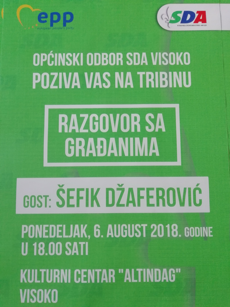 Općinski odbor SDA Visoko Vas poziva da svojim prisustvom uveličate obilježavanje 28. godišnjice osnivanja SDA Visoko i prisustvujete tribini ”Razgovor s građanima” na kojoj će se predstaviti kandidat za bošnjačkog člana Predsjedništva BiH gosp. Šefik Džaferović.