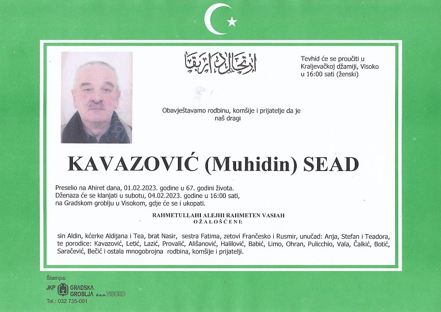 KAVAZOVIĆ (Muhidin) SEAD 04.02.2023. godine u 16:00 sati 3. Februara 2023. KAVAZOVIĆ (Muhidin) SEAD 04.02.2023. godine u 16:00 sati