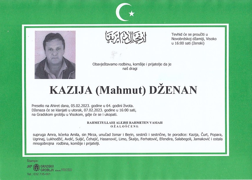 KAZIJA (Mahmut) DŽENAN 07.02.2023. godine u 16:00 sati 7. Februara 2023. KAZIJA (Mahmut) DŽENAN 07.02.2023. godine u 16:00 sati