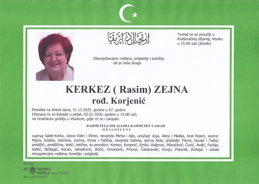 KERKEZ (Rasim) ZEJNA 02.01.2026. u 15:00 sati