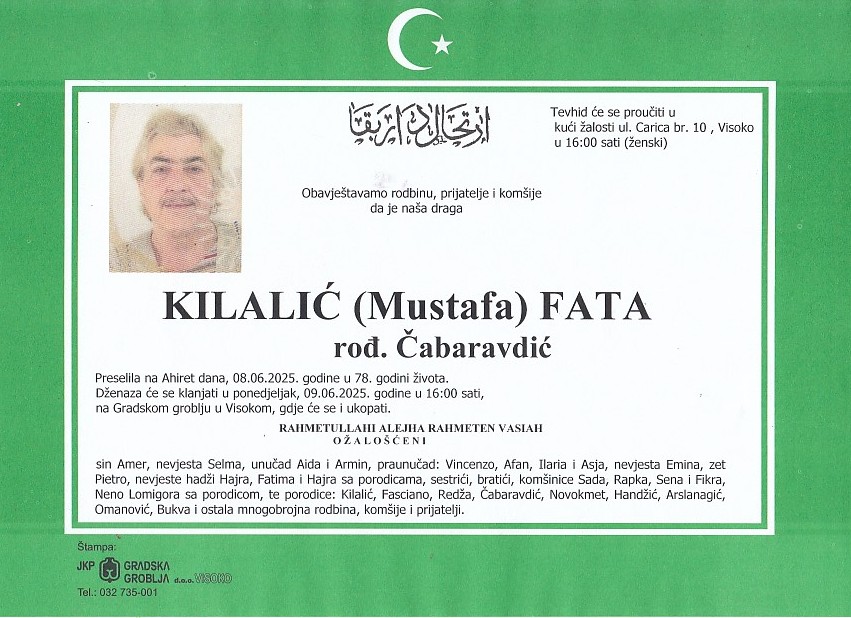 KILALIĆ (Mustafa) FATA 09.06.2025. godine u 16:00 sati 9. Juna 2025. KILALIĆ (Mustafa) FATA 09.06.2025. godine u 16:00 sati