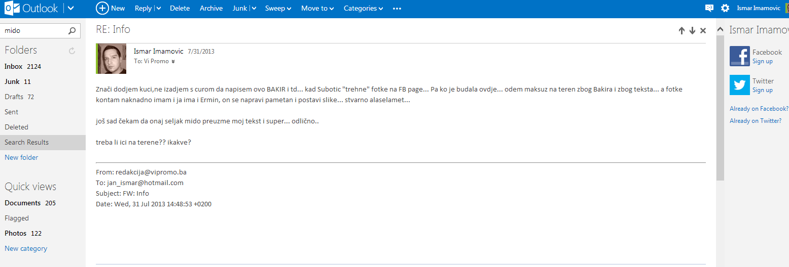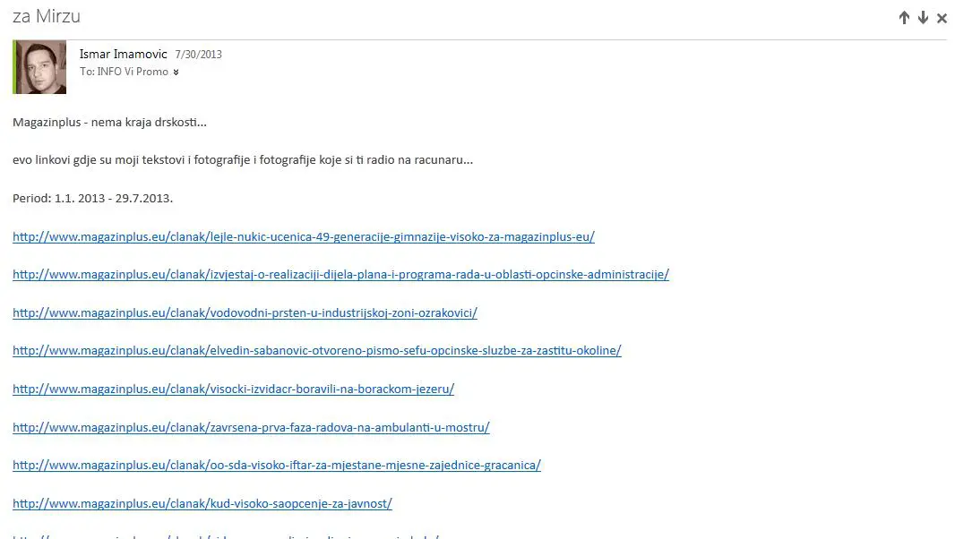 Imamović tako kopira privatne razgovore od glavnog urednika Alena Jazića do novinara honorarca Amara Kulovića. I sam Imamović je u interesantnom statusu na RTV Visoko o kojem ostali uposlenici ne znaju ništa, neki misle da je volonter, dok drugi smatraju da je angažovan na ugovor o djelu u visini od 350KM, što mu nije dovoljno pa honorarno „odrađuje“ prljave poslove i za nepotrebnu medijsku pojavu u Visokom zvanu Gradski Portal Vipromo koji kontinuirano već zadnjih godinu dana obmanjuje javnost i prlja medijski prostor u Visokom i najsočnijim uvredama i klevetama pokušava diskreditirati druge medije i novinare.