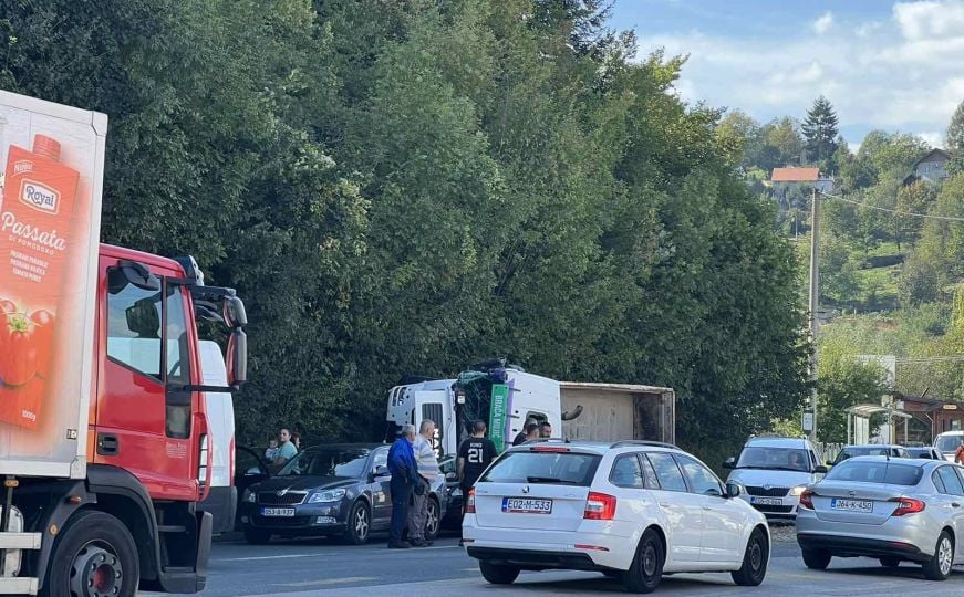 Uslijed jakog udara, kamion se prevrnuo na bočnu stranu.