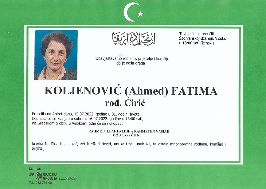 KOLJENOVIĆ (Ahmed) FATIMA 16.07.2022. godine u 18:00 sati 16. Jula 2022. KOLJENOVIĆ (Ahmed) FATIMA 16.07.2022. godine u 18:00 sati