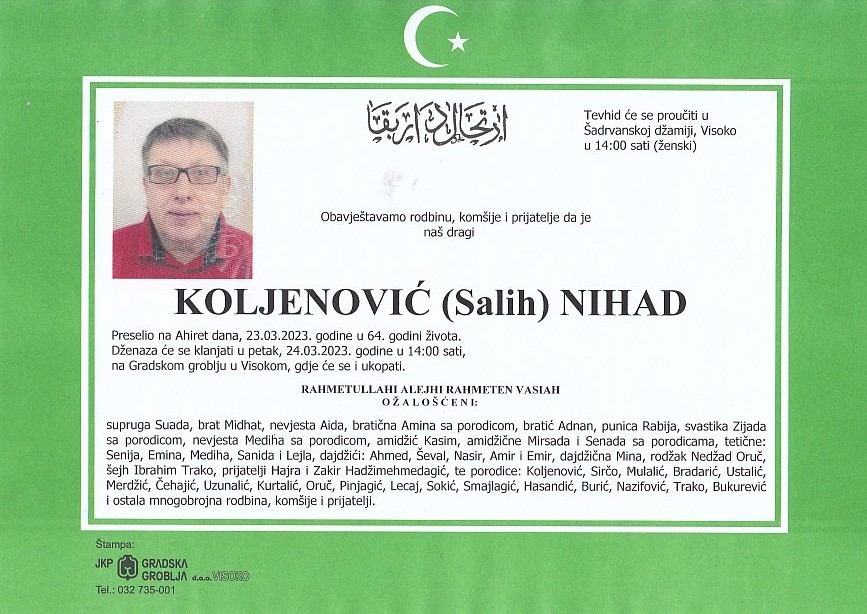 KOLJENOVIĆ (Salih) NIHAD 24.03.2023. godine u 14:00 sati 23. Marta 2023. KOLJENOVIĆ (Salih) NIHAD 24.03.2023. godine u 14:00 sati
