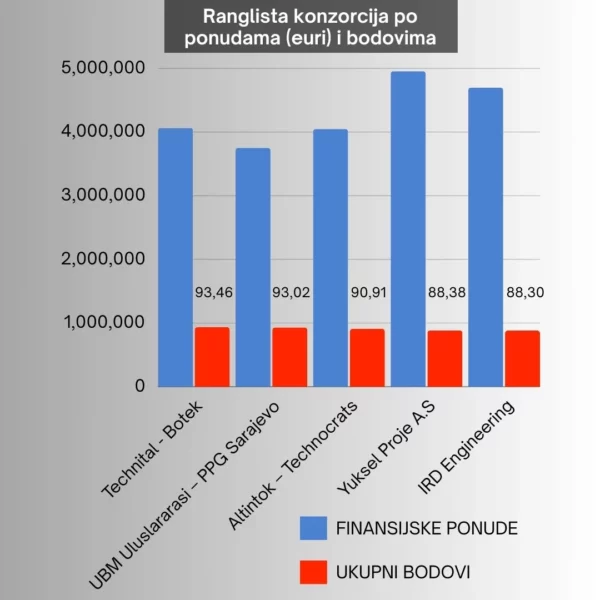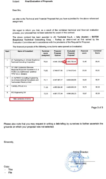 Iz Trase d.o.o. Sarajevo, koja je pripremala ponudu za italijansku kompaniju Technital S.P.A, navode da je došlo do manipulacija s njihovom ponudom. Prvobitna ponuda Technitala iznosila je 4.646.129 eura, ali je nakon prijavljene aritmetičke greške smanjena na 4.063.756 eura, što je omogućilo da Technital osvoji tender za 0,45 bodova.