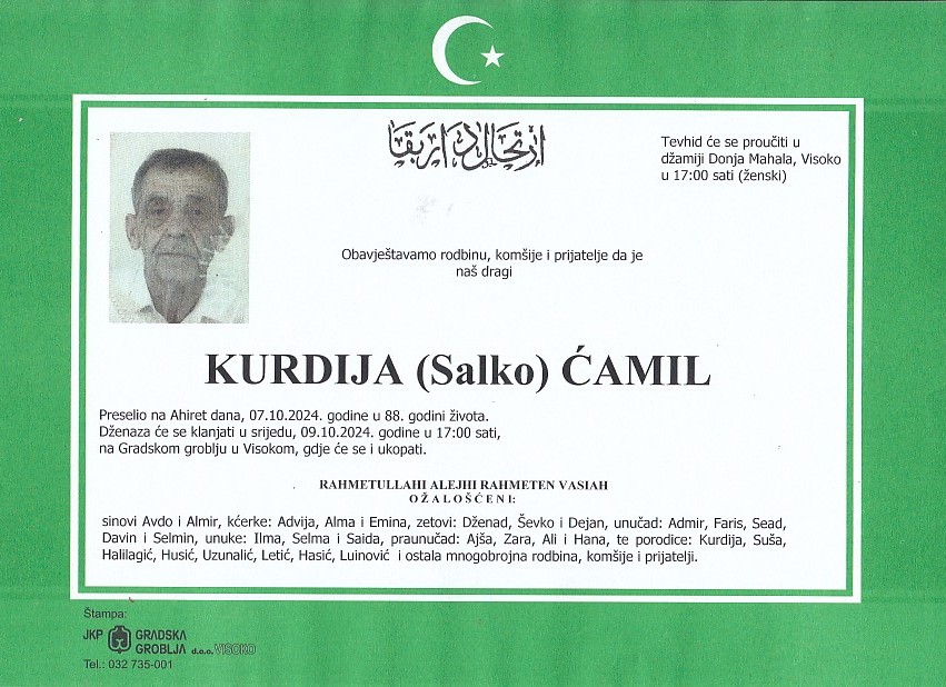 KURDIJA (Salko) ĆAMIL 09.10.2024. godine u 17:00 sati 9. Oktobra 2024. KURDIJA (Salko) ĆAMIL 09.10.2024. godine u 17:00 sati