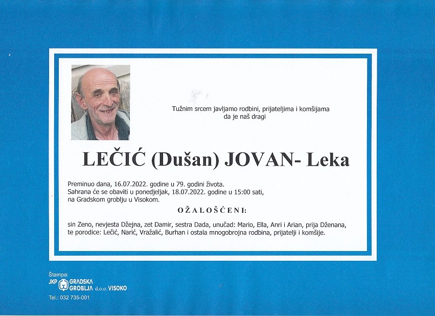 LEČIĆ (Dušan) JOVAN 18.07.2022. godine u 15:00 sati 16. Jula 2022. LEČIĆ (Dušan) JOVAN 18.07.2022. godine u 15:00 sati