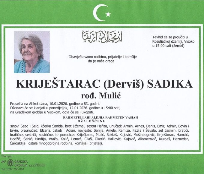 KRIJEŠTARAC (Derviš) SADIKA 12.01.2026. u 15:00 sati