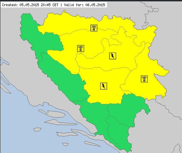 Zbog visokih temperatura zraka i grmljavine Meteoalarm je za sutra izdao žuto upozorenje za regije Sarajevo, Banja Luka, Prijedor, Višegrad i Tuzla, objavili su i Federalni i Hidrometeorološki zavod RS-a.