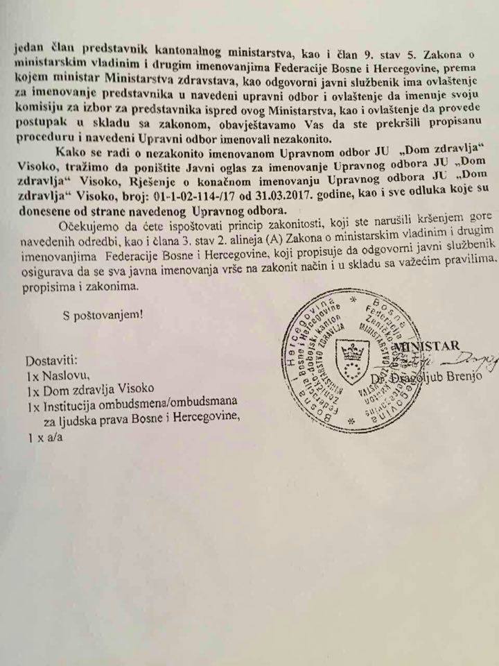 Nakon uvida u navedeni dopis i ostalu dokumentaciju vezanu za postupak imenovanja Upravnog odbora JU “Dom zdravlja” Visoko, obavještavamo Vas da je procedura imenovanja navedenog Upravnog odbora provedena suprotno članu 64. stav 5. Zakona o zdravstvenoj zaštiti, koji obligatorno propisuje sastav upravnog odbora zdravstvene ustanove čiji je osnivač Općina i članu 9. stav 5. Zakon o ministarskim vladinim i drugim imenovanjima FBiH.