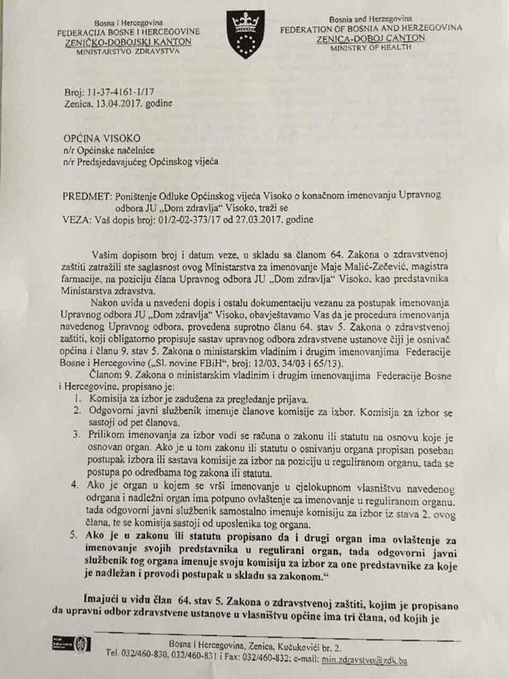 Nakon uvida u navedeni dopis i ostalu dokumentaciju vezanu za postupak imenovanja Upravnog odbora JU “Dom zdravlja” Visoko, obavještavamo Vas da je procedura imenovanja navedenog Upravnog odbora provedena suprotno članu 64. stav 5. Zakona o zdravstvenoj zaštiti, koji obligatorno propisuje sastav upravnog odbora zdravstvene ustanove čiji je osnivač Općina i članu 9. stav 5. Zakon o ministarskim vladinim i drugim imenovanjima FBiH.