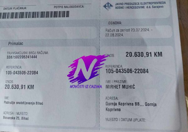 Račun je iznosio 20.630,91 KM za period 23.7. – 22.8. 2024. godine.