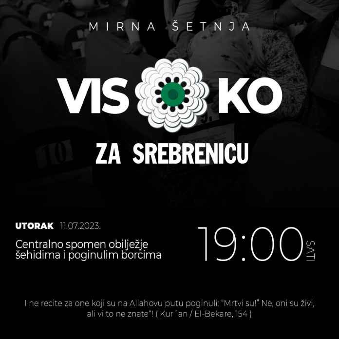 Šetnja je planirana za UTORAK, 11.07.2023., sa početkom u 19:00 sati na Centralnom spomen obilježju u Visoko i kretat će se do Trga žrtava genocida gdje će se položiti cvijeće i proučiti fatiha.DA SE NIKADA NE ZABORAVI I NIKADA I NIKOME NE PONOVI, SREBRENICA