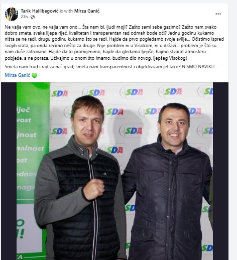 Mladi član SDA Visoko i Asocijacija mladih SDA BiH, Tarik Halilbegović, oglasio se emotivnom porukom podrške gradonačelniku Mirzi Ganiću, osvrćući se na javne kritike koje dolaze na račun rada gradske uprave.