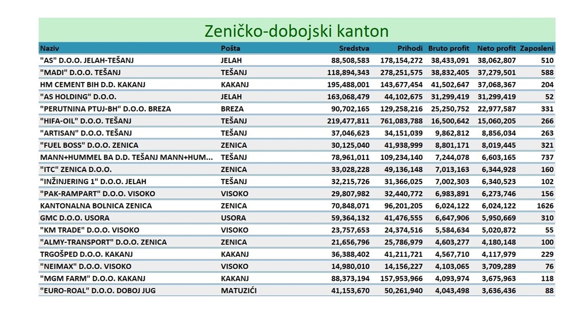 Portal Biznis.ba objavio je danas listu 20 najuspješnijih kompanija iz Zeničko-Dobojskog kantona za kojeg se nerijetko kaže da je motor razvoja FBiH.