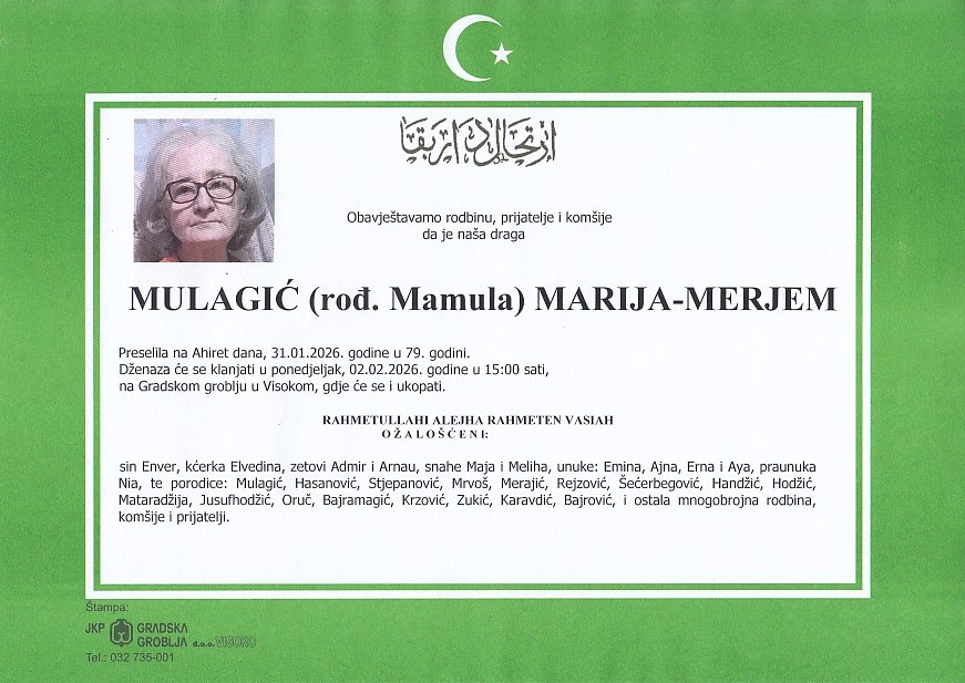 MULAGIĆ (rođ. Mamula) MARIJA-MERJEM 02.02.2026. u 15:00 sati