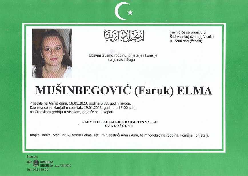 MUŠINBEGOVIĆ (Faruk) ELMA 19.01.2023. godine u 15:00 sati 18. Januara 2023. MUŠINBEGOVIĆ (Faruk) ELMA 19.01.2023. godine u 15:00 sati