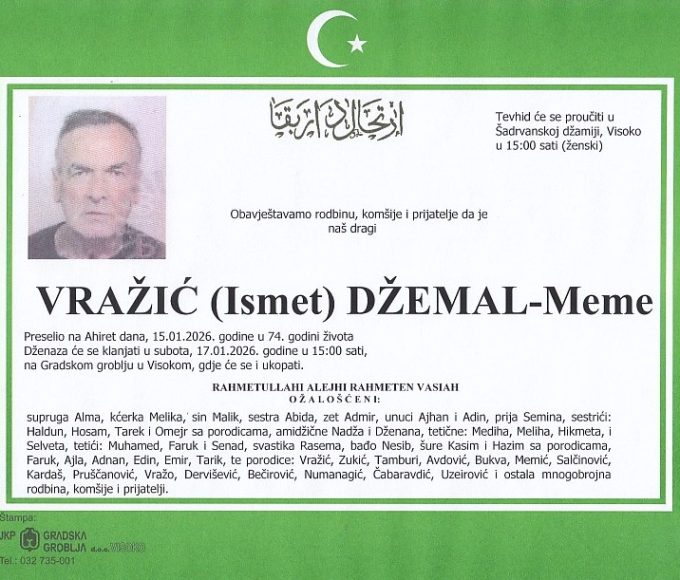 VRAŽIĆ (Ismet) DŽEMAL 17.01.2026. u 15:00 sati