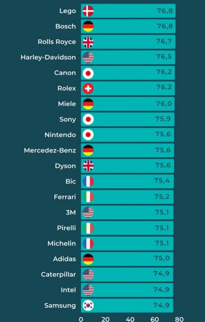 Već više od decenije The RepTrak Company rangira 100 najuglednijih firmi te tako analizira korporativnu reputaciju za vodeće svjetske firme. Rezultati se odnose na ocjenu koju je frima postigla na listi od 0 do 100 bodova. Na prvom mjestu s najboljom ocjenom, 76,8, ponovo se našao LEGO Group, firma za proizvodnju igračaka sa sjedištem u Billundu, u Danskoj, koja je najpoznatija po proizvodnji igračaka marke LEGO.