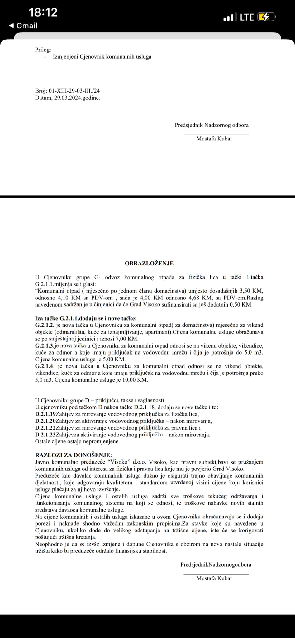 👉🏼 Gradski vijećnici su dobili materijal za 38-u sjednicu Gradskog vijeća Visoko koja bi se trebala održati 25.04.2024 godine, u kojem će se između ostalog u tački 8 razmatrati Prijedlog Odluke o davanju saglasnosti na izmjeni i dopuni Cjenovnika usluga JKP “VISOKO“ d.o.o. Visoko a to je konkretno povećanje cijene odvoza smeća s 3,50 KM po članu da će se povećat se na 4.0 KM što je s PDV-om povećanje na 4,68 KM ⁉️