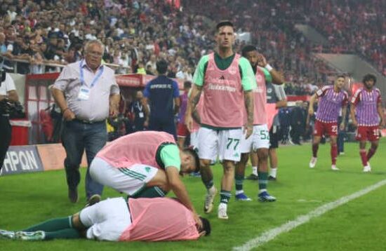 Navijači tima iz Pireja su u 53. minutu utakmice gađali rezervne fudbalere Panathinaikosa petardama, a jedna od njih pukla je u blizini glave fudbalera iz Španije.