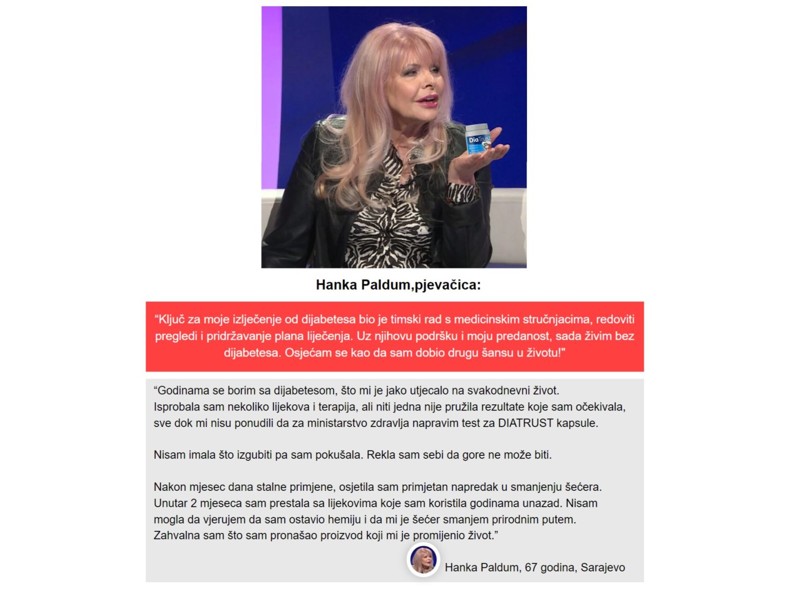 Reklama sadrži i link koji vodi na stranicu na kojoj je objavljen tekst u formi navodne ispovijesti Hanke Paldum o tome kako je “izliječila dijabetes” nakon što joj je ponuđeno da za “ministarstvo zdravlja” testira DiaTrust kapsule.