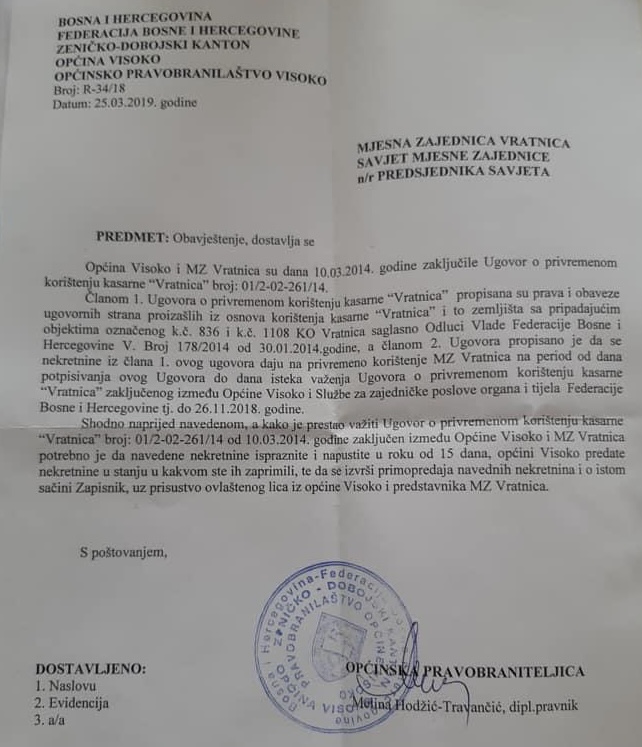 Stvarna istina je da je 25. 03. 2019. godine napisala “obavještenje” savjetu Mjesne zajednice Vratnica da, u roku od 15 dana, isprazni kasarnu i istu vrati općini Visoko. Kao dokaz predstavljam Vam dokument broj R-34/18.
