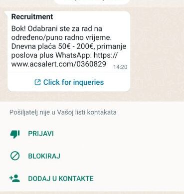 Naime, na svoje WhatsApp račune su dobili poruke u kojima ih se obavještava da su primljeni na određeni posao. Trebaju naravno kliknuti na poveznicu i tako doći do dugo traženog “posla”.
