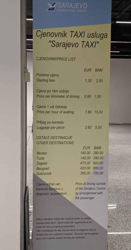Na aerodromu Sarajevo unutar i ispred aerodroma na putnicima jasan i dostupan način postavljene su cijene taxi usluga “Sarajevo Taxi”, tako da će turisti koji dolaze u grad biti odmah informisani o cijenama, bez da im one poslije budu previše naplaćene.