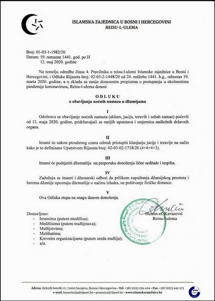 Od sutra će u Bosni i Hercegovini biti dozvoljeno obavljanje noćnih namaza u džamijama, odluka je Rijaseta Islamske zajednice u BiH koju potpisuje reisu-l-ulema Husein ef. Kavazović.