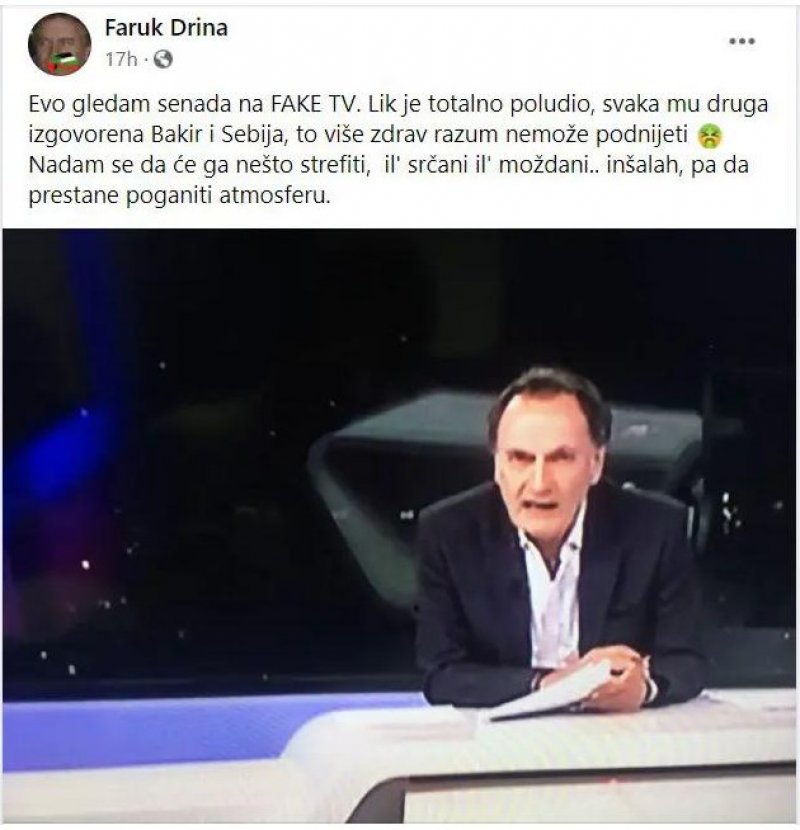 “Evo gledam senada na FAKE TV. Lik je totalno poludio, svaka mu druga izgovorena Bakir i Sebija, to više zdrav razum nemože podnijeti. Nadam se da će ga nešto strefiti, il’ srčani il’ moždani.. inšalah, pa da prestane poganiti atmosferu”, naveo je u jednom.