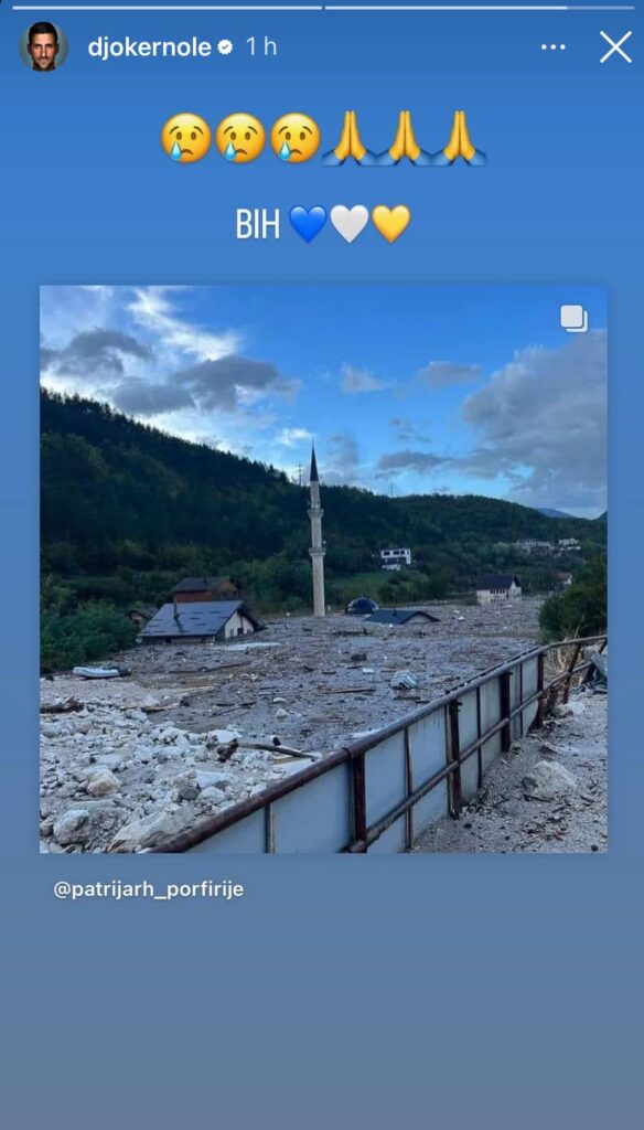 Popularni Nole je na story objavio fotografiju poplavljenih područja u našoj zemlji, a uz uplakane emotikone, postavio je i tri emotikona sa molitvama namijenjena Bosni i Hercegovini.