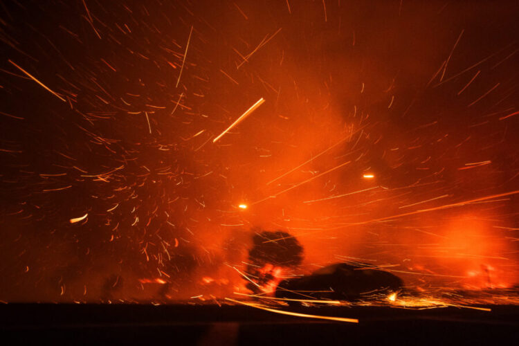 Svjedoci su izvijestili o velikom broju kuća u plamenu koji je gotovo spalio njihove automobile kada su bježali s brda kanjona Topanga, dok se vatra širila odatle do Tihog oceana.