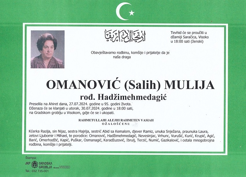 OMANOVIĆ (Salih) MULIJA 30.07.2024. godine u 18:00 sati 30. Jula 2024.3. Augusta 2024. OMANOVIĆ (Salih) MULIJA 30.07.2024. godine u 18:00 sati