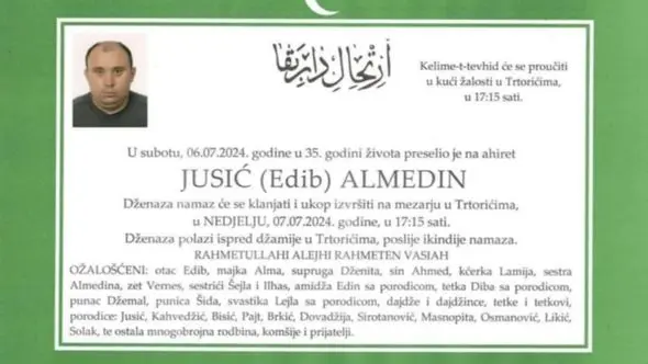 Dženaza Almedinu Jusiću će se klanjati danas u 17:15 sati na mezarju u mjestu Trtorići kod Breze.